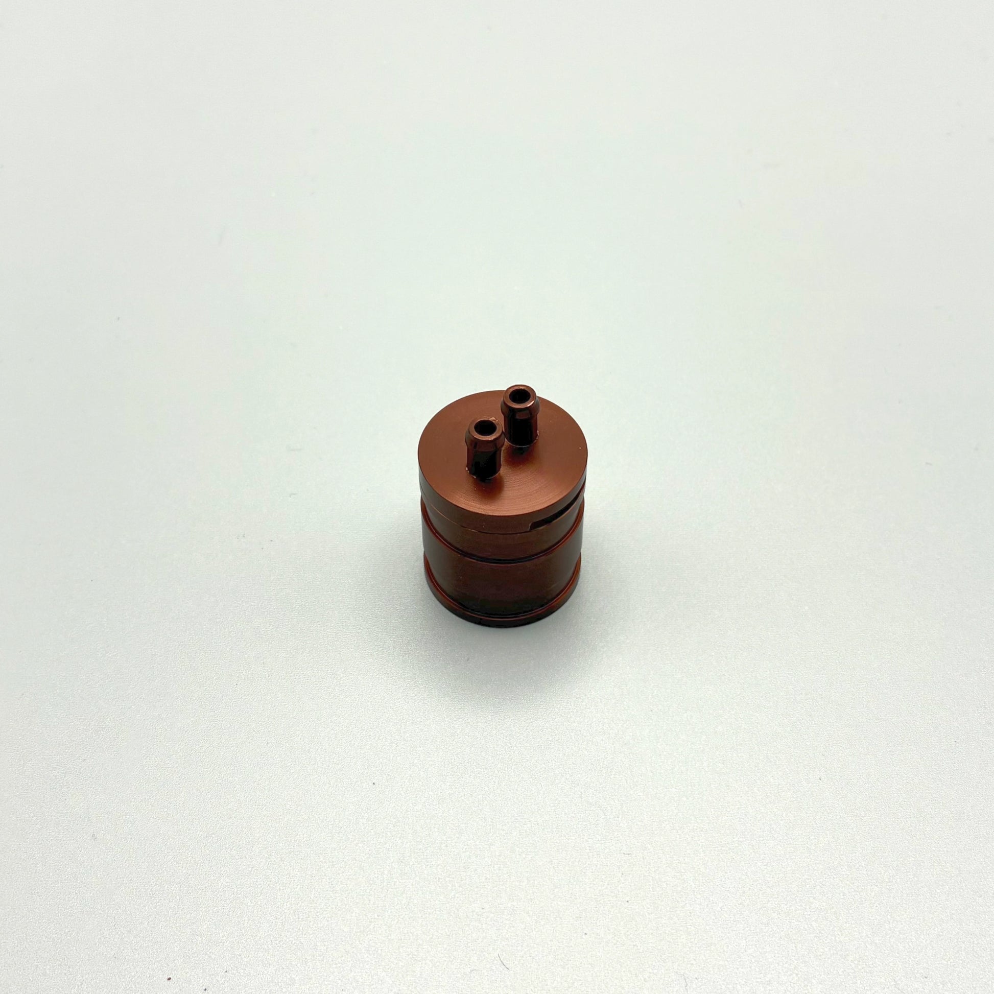The vent can is CAD drawn from a genuine factory part and CNC machined in two pieces, assembled with open cell foam and anodised in works mag bronze.